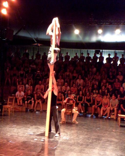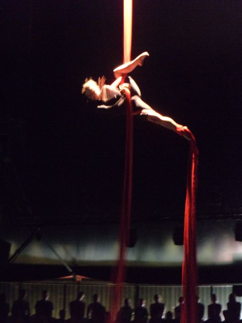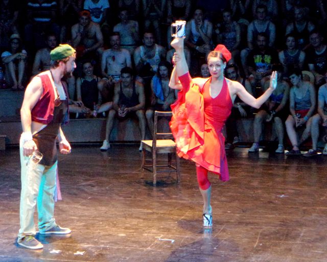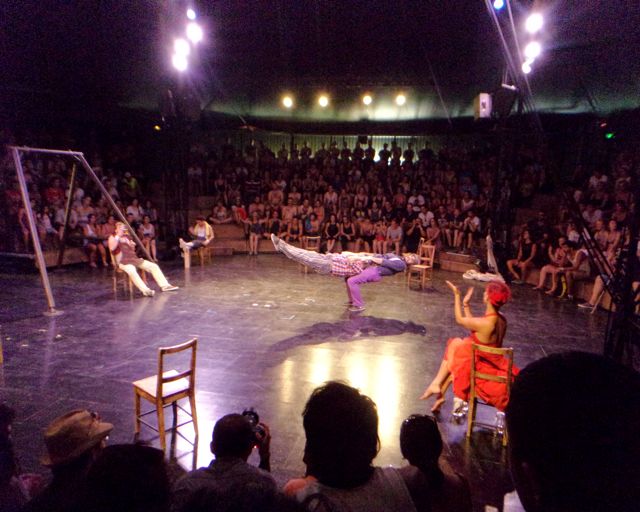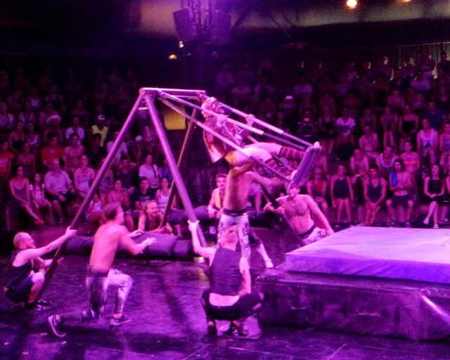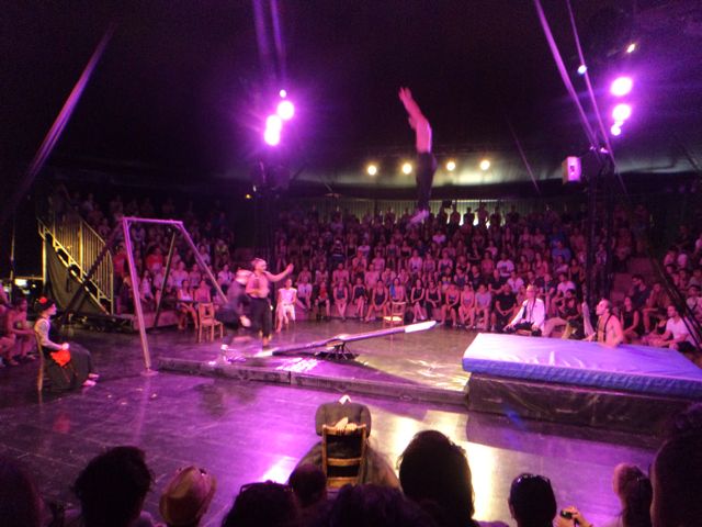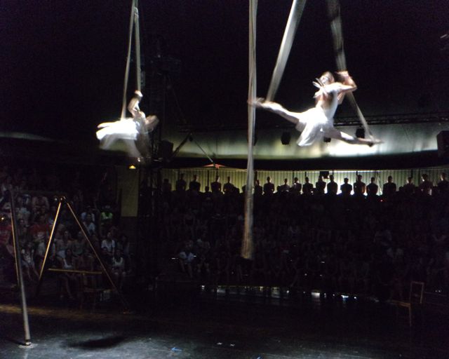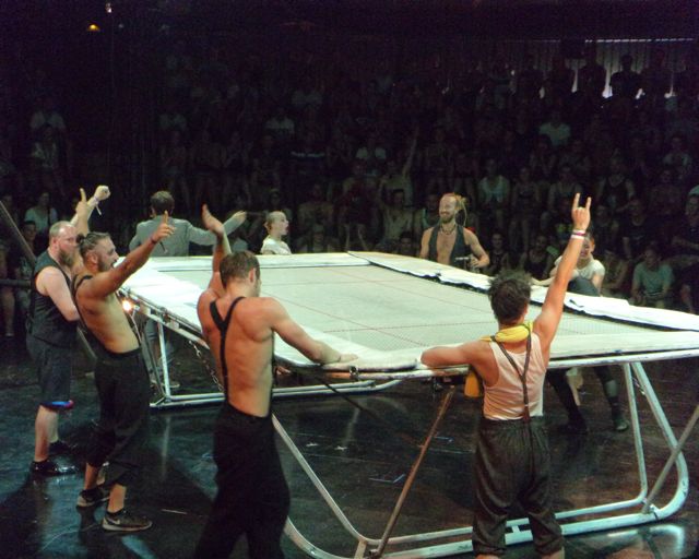 The show itself has been made especially for Sziget and I  must say it is pretty impressive.  The first part is a pub fight with a ballerina dancing in beer glass instead of ballet shoes. If you get lucky enough and sit in lower seats, you get a beer from them. Nice and refreshing. Although it is Dreher and not a Czech beer, which they are speaking so nice about at the beginning of the show.  Then you have a trampoline guy jumping with knives, wooden plank climbing, guy in a huge loop, ballet dancers on ropes, slide jumping and many more. The show lasts 45 minutes and the performances are breath taking! As this was their first performance at Sziget, they were very happy everything worked out and the people liked it. The standing ovation was well deserved and I was very surprised by the second ovation they got when the crowd was leaving the cirque and saw the performers outside. It was truly a great show and I recommend everybody to grab a chance to see them – the show starts every day at 18:00.
